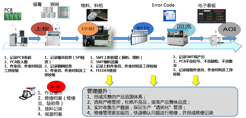 從客戶下單、物料采購、材料入庫、SMT貼片加工、COB邦定、后焊插件 、AOI、QC和出庫等各個生產(chǎn)環(huán)節(jié)的數(shù)據(jù)進(jìn)行實(shí)時采集,對數(shù)據(jù)進(jìn)行跟蹤、管理與統(tǒng)計分析。從而進(jìn)一步幫助企業(yè)將工廠生產(chǎn)網(wǎng)絡(luò)化、透明化、無紙化以及精細(xì)化落地,做到產(chǎn)品可溯源。